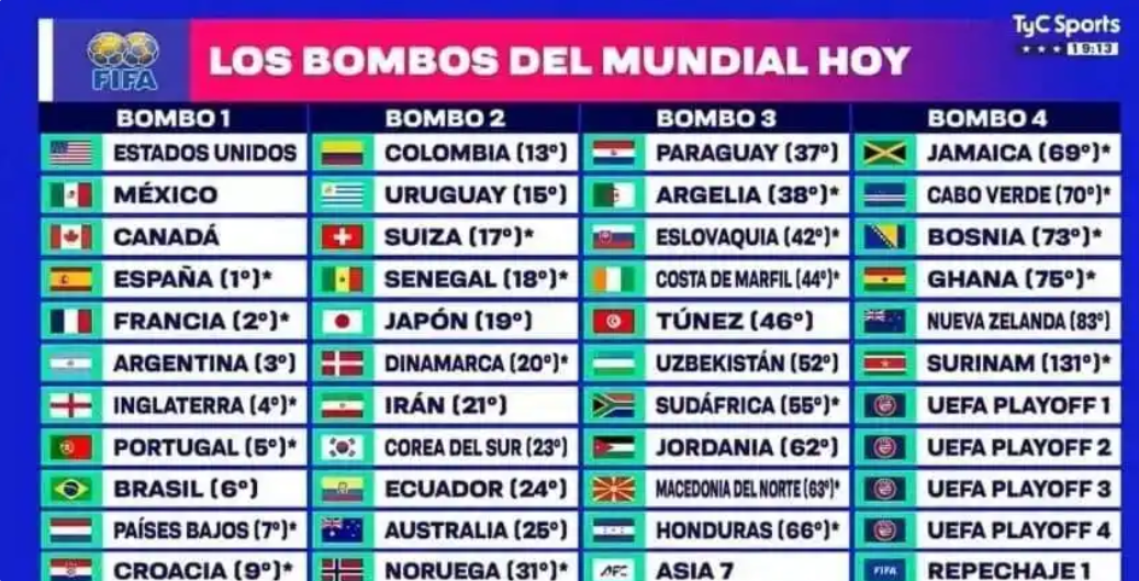球队分档将根据国际足联排名确定:第一档为东道主加排名最高的9支队伍。